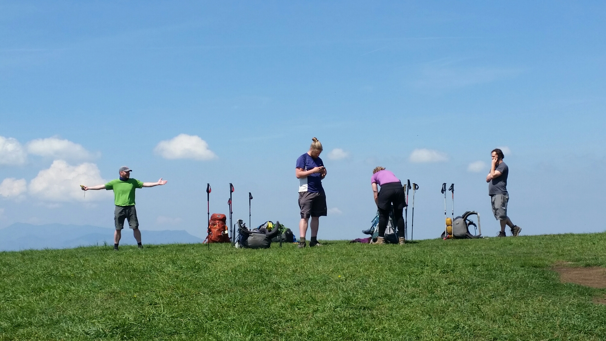 Not a hundred feet down the trail, I heard Teddy cursing again. I couldn’t believe it, his shoes and literally ripped in half, just below the laces. His foot was sticking out the front of his shoe looking like a tongue flopping around.  I passed him as he tried to tape it, hiking up around the back of the mountain, climbing through the mowed fields, we ascended. Spiraling back and forth across the hill side we could see what awaited us at the top.  Andrew Ultra Notlight and I finally came to the top, meeting Card Shark and Kevin, taking in our splendid views.  The clear sky allowed you to see for miles, the sweet cool breeze took the hint of heat away and gave you the most exciting feeling on our sweat soaked skin.  We all stood in amazement of the wonder and beauty of Max Patch.  The past two days were worth all the hassle for this, it was truly a wonder to be had.