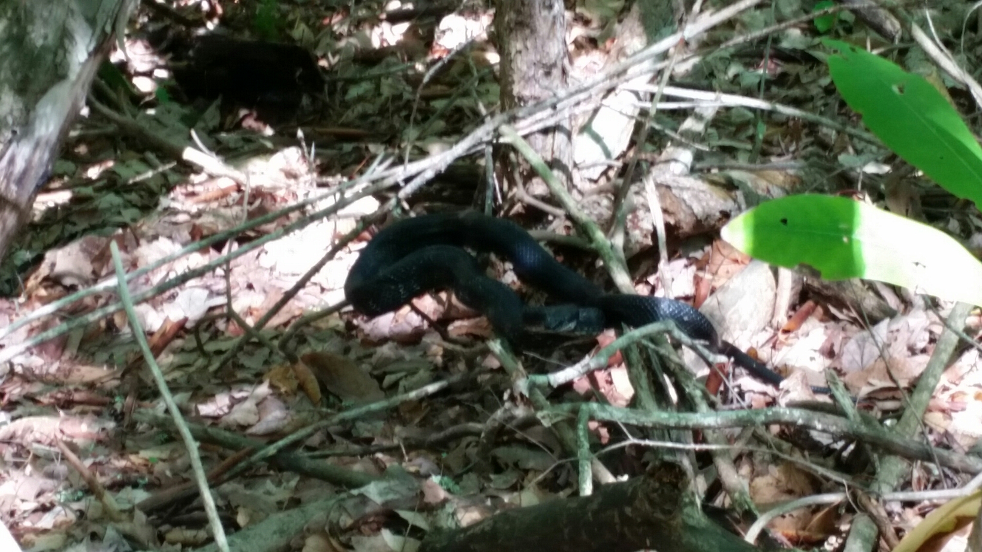 Here in the middle of the trail was a large snake, this big black snake was poised to strike. His tail fluttering in the leaves, imitating the rattlesnakes in the egion as a defense mechanism, he meant business. Dropping my gear I gave him space to move, reaching for a stick longer than my poles, I guided him off the trail and took a photo of him. I then waited, watching,calling out for Gadabout to come check him out. I must have been there for a long time, by the time he arrived I was getting cold from the sweat cooling me. Snapping some photos, the two of us hiked to the shelter.