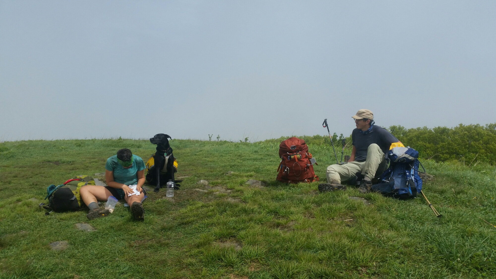 Climbing out of the shelter we ascended the first bald, only to find we were definitely in cloud cover for the day. We climbed and climbed with her dog Cash nipping at our heels. A cash is such a cool dog, so friendly, lovable, the best kind of dog to have around. Our morale was fairly high as we climbed to the top of the mountain. Taking a quick break we realized we were no where near the actual top, but instead on a large hill before. The sheer white out conditions masked everything from view. We began our next climb under sever winds and clouds or fog, I’m actually not sure what to call it since fog is on the ground but we were in the clouds.