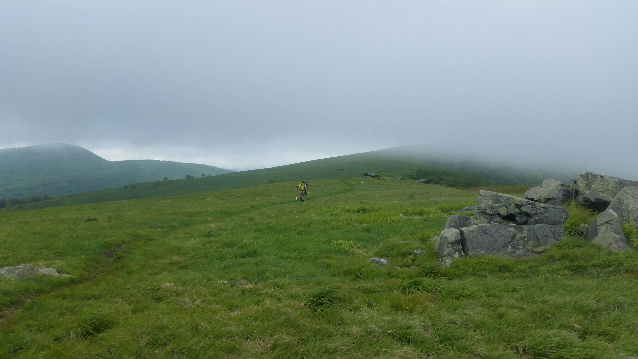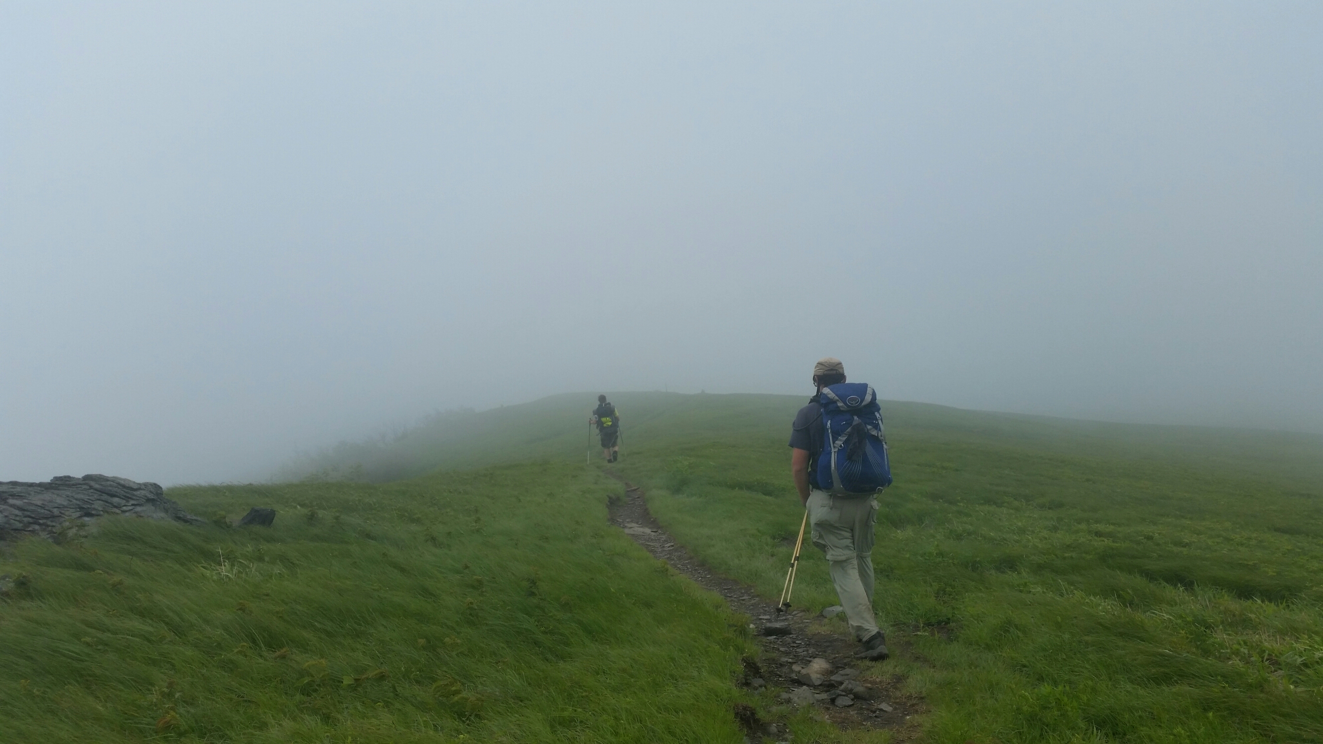 Waking up at Over Moutain shelter I was quickly dismayed, there would be no sunrise this morning with the wind and rain. I yelled as I got out of my tent, it seems that I’m just missing the good stuff by a day or hours sometimes. Grabbing all my things, I headed for the shelter to pack and break down my tent. I wasn’t the only one with the same idea it seemed. Hanging my tent up to drip some I ate breakfast and planned my day with Huckleberry and MacKenzie. We were all headed to Roan Mountain and it looked like it was going to be along day with the fog and clouds.