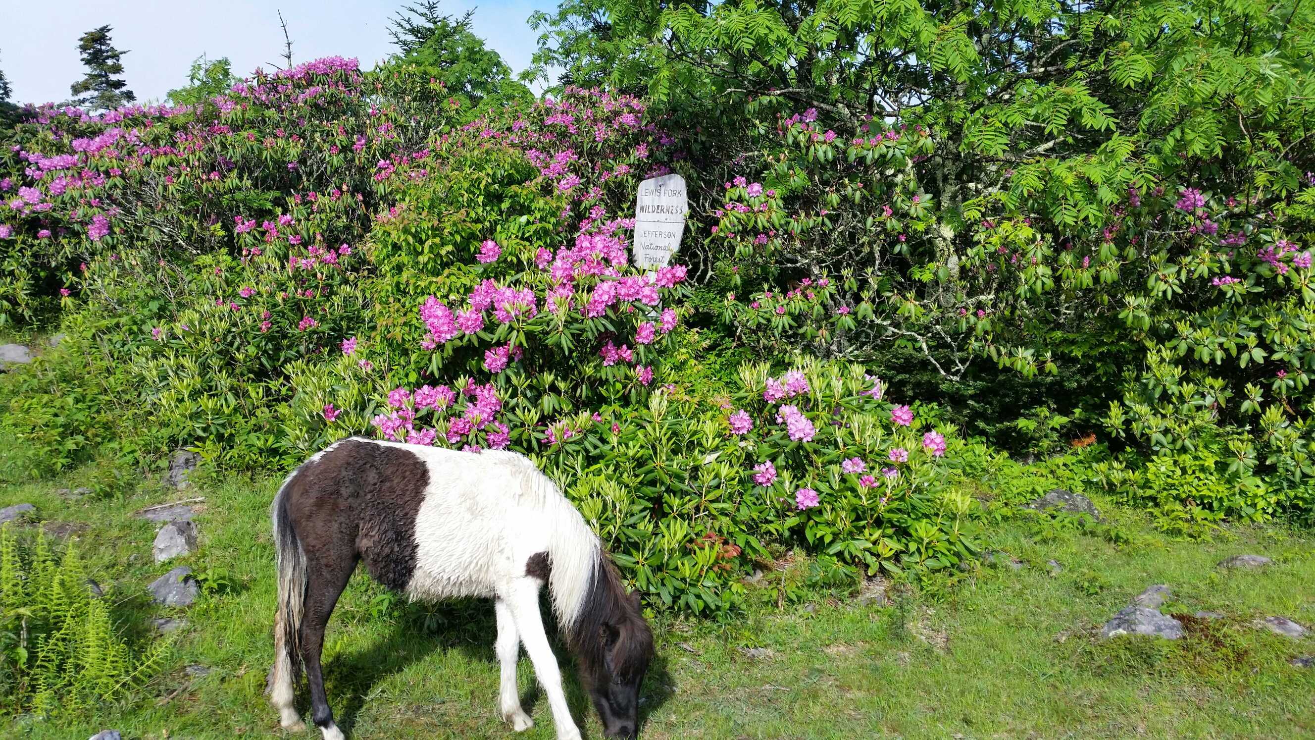 Just as I came out of the rhododendron garden there he stood, a white and tan adolescent pony, munching away on the grass. His focus so strict he didn’t even look up to see me. I stood there taking pictures before climbing the huge rocky crag, allowing me numerous views of the highlands before me. The sky had started to clear and with the fog lifting I hung around till Packer Hat and Rubber Ducky showed up. Watching the pony and goofing off we hiked back to the trail determined to enjoy the next few miles. Our first bit was uphill through rocks over a stone hill top and back down. Just as we crested, we could see for miles and miles, this one view gave us a glimpse of a herd of ponies in the distance as well as the day old foal with its mother.