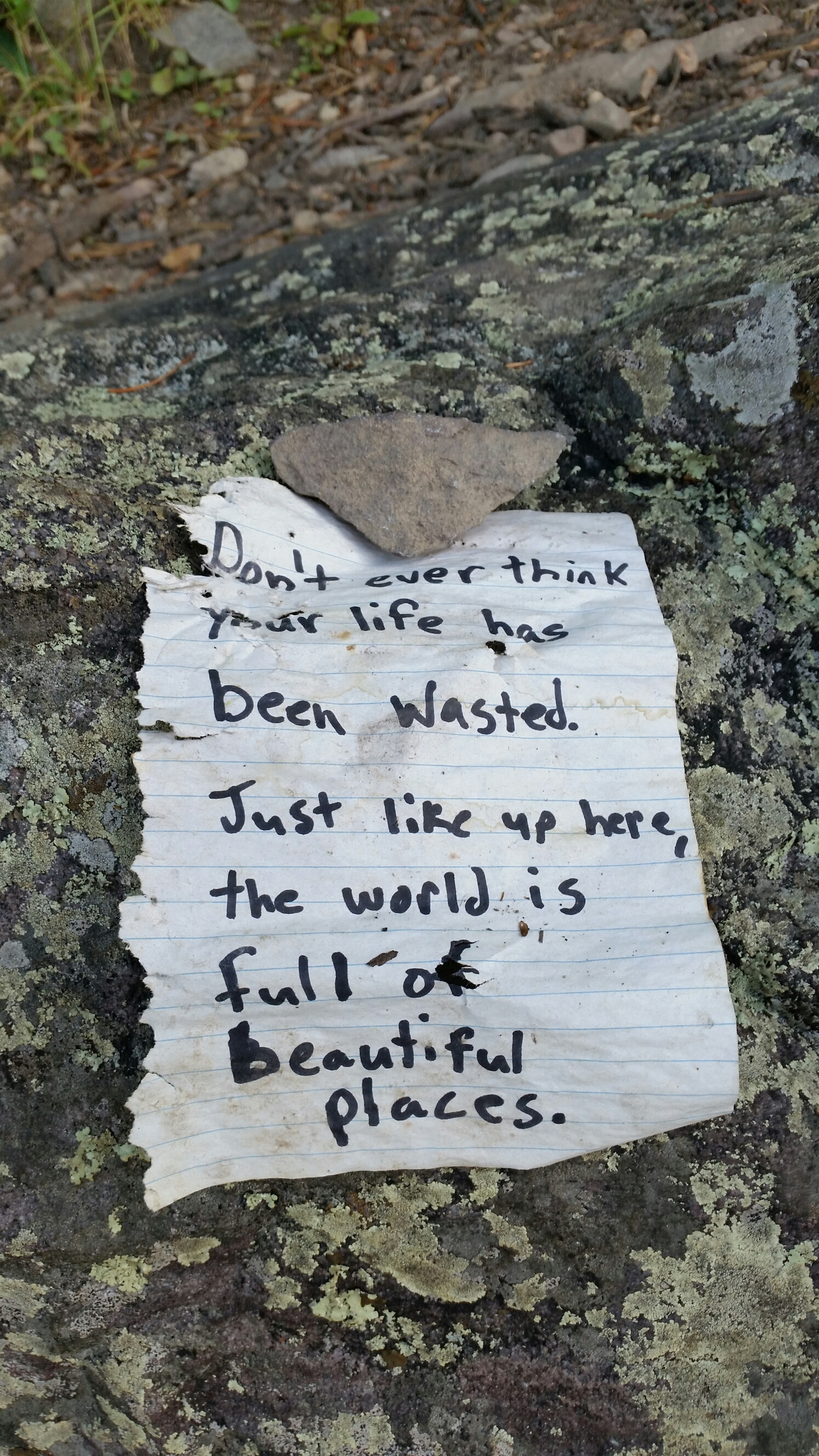 The day was the longest day in the year and that meant hike naked day. Diesel and I continued our getting to know each other as we climbed the mountain. We were both feeling down and trying to motivate the other, he was missing his dad on father’s day and I was deep within the Virginia Blues. Climbing to the best view of the day we found just what we were looking for. Here was this little note weather and pinned under a rock, like a gift from God. Reading it he started to well up a bit and I felt it in my soul. We stood there looking at the view, taking in the message. At the top of the mountain he called home leaving at emotional message as I looked into the distance giving him space and getting lost in my thoughts.