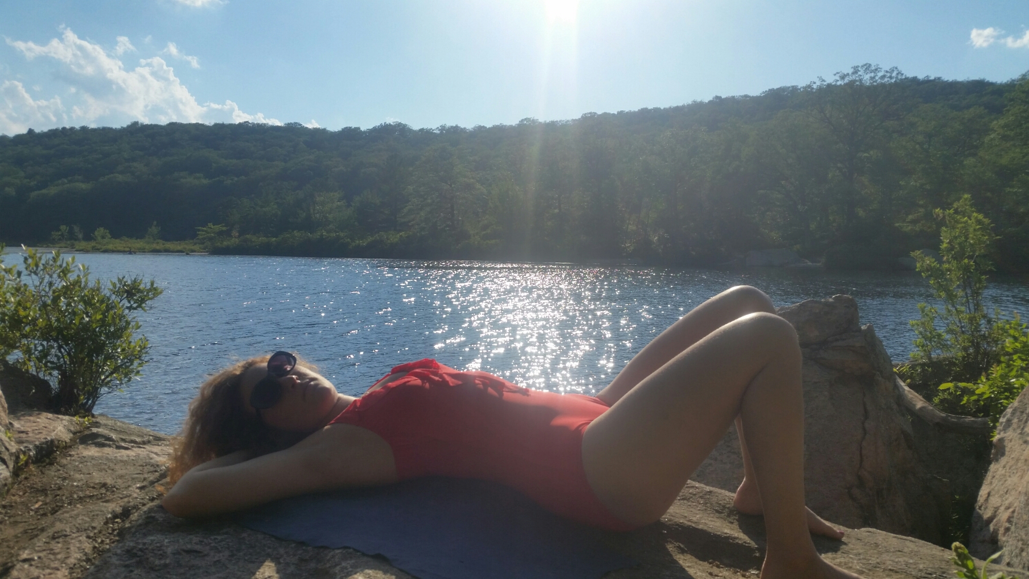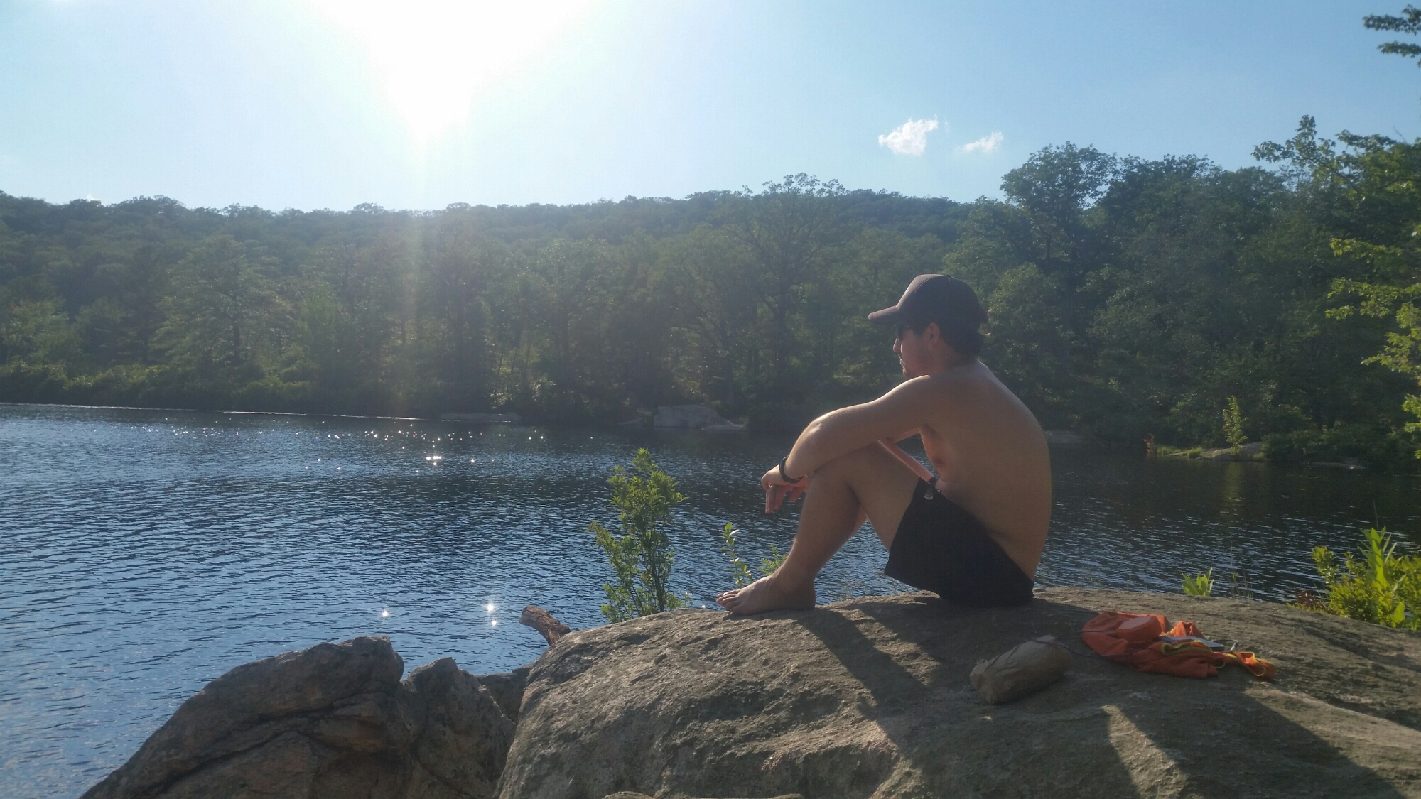 The three of us chatted for quite some time before we were joined by our day hiker again. Her name was Samantha and she didn’t live to far away. She had come to go swimming at the lake and I heard the perfect excuse to stop hiking for the day. With that the four of us were up and over the hill towards the lake. Caesar would decline and so would Luigi, swimming in a lake, what was wrong with them? The two of us were off on our own adventure. I called back a few times goading Luigi into coming with us, finally her took the bait and joined us. Walking out to some rocks she took off her shoes and went right in. I dropped my gear and clothes and dove in after and Luigi followed me in.