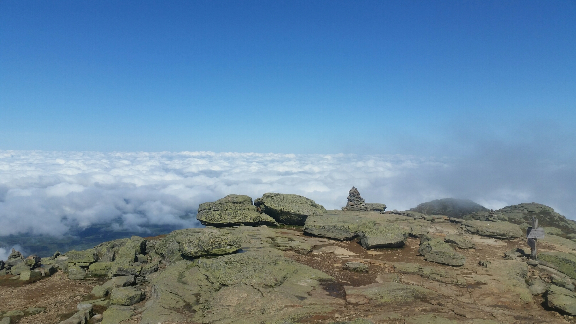 Just then the trail popped out form below the hut and we blew in like the night wind, through the door. The wonderful Hutese as I call them fed us and allowed us to dry out for the morning before we climbed up to the summit again and into a beautiful day. Reaching the top I was blessed to have clear skies and a good wind going. Setting my stuff out to dry, I placed rocks on them to keep from blowing away. Little did I know that the very rocks I used to keep my sleeping pad from disappearing in the high winds would render it unusable for a week. Once everything was dried and conversations with the day hikers were had, I set off down the trail and down the remainder of the ridge before disappearing back into the woods.