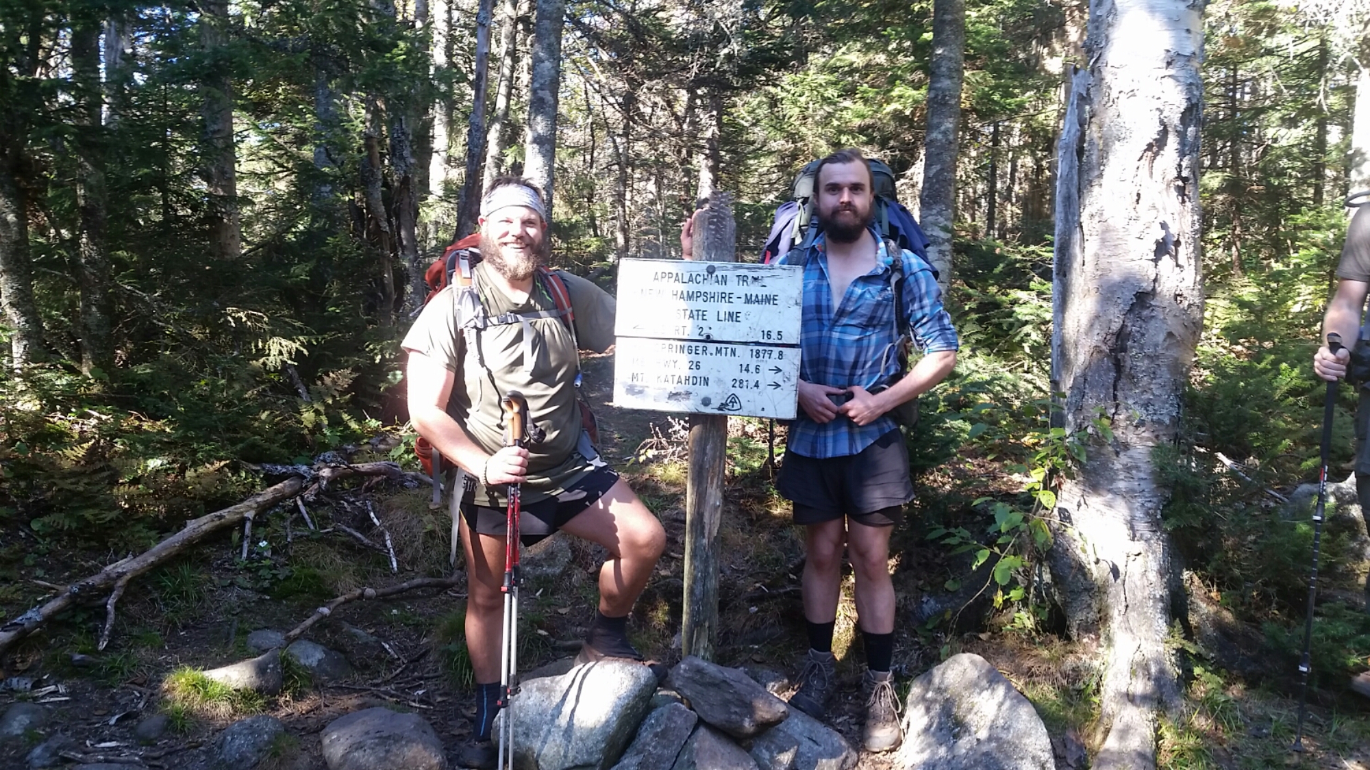 Taking our time to relax we pushed out for the boarder. Up and over the muddy peaks we pressed on, Flailing and I together. New Hampshire was pushing hard to not let us go. the terrain became almost impassible as we stepped closer and closer to the boarder. Cliff was synonymous with trail at this point. New Hampshire was determined to be one tough state all the way to the bitter end as I climbed down huge boulders and sheer cliffs to the state line. Finally reaching it, I was greeted by some familiar faces as well as old ones. We took our nice photos as well as our goofy ones before packing up again and stepping into Maine.