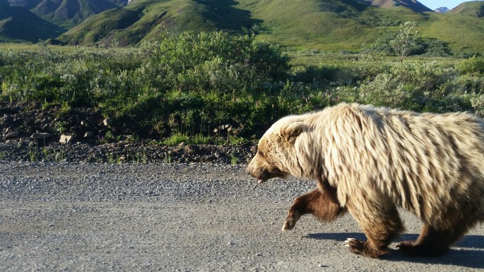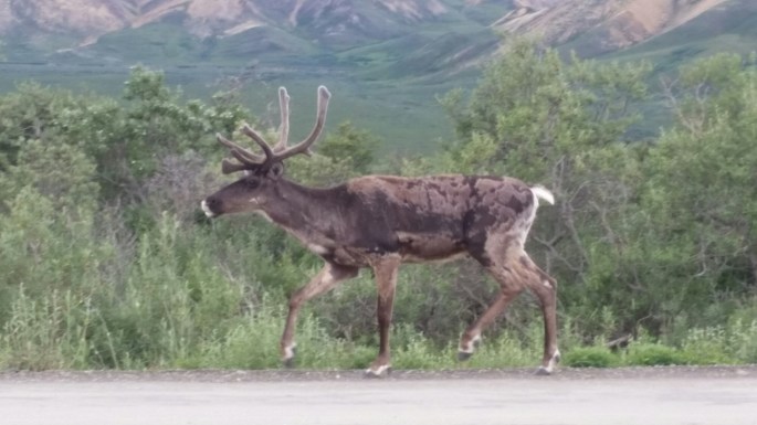 As we stood there waiting for the bus to pick us up, I heard a distinct sound off hoof steps on the gravel road. Calling Sierra over, we stood and watch in amazement as this lone bull caribou came into view. I had plenty of time to catch a few pictures as we stood motionless and quiet as he passed, stopping to graze a few feet from us. He passed within just a few feet before heading down a drainage and into the alders. Most of the wildlife we saw, was from the bus, for the rest of the season.