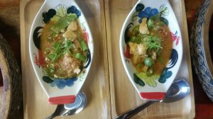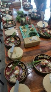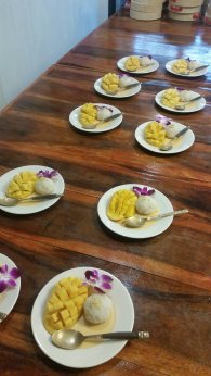 We learned the difference between jasmine rice & sticky rice and differences in preparation for the two. Our first tasks included making coconut milk & cream, and tamarind paste, both fairly labor instense activities. We also handmade the curry paste for our curry dishes, which was also very labor intensive, involving good rhythm with thebmortar & pestle. Our instructor said this is how you show you’re good wife material and how to impress your mother-in-law, based on how well you can make the curry paste!