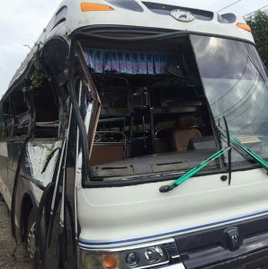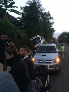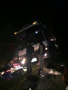 Around 6am, we were nearing the end of the drive, estimating only about 2 hours left considering the late start. Suddenly, the driver starts blaring the horn louder than his normal honking. At the same instant, I saw headlights coming right alongside our bus, as a crashing noise begins. We’re all jolted to the left as the bus is skidding along, then thrown to the right side of the bus as we came to an immediate halt. My first thought was we’ve been struck by the vehicle. Immediate yells and confusion begins as people are waking up in a tossed state, trying to figure out what just happened. Steve had been thrown from the top bunk to the aisle, but caught himself enough to be able to break my fall as I was tossed the same direction. Lights are dim in the bus and it’s still dark outside. One of the girls below me is becoming frantic as she discovers she’s bleeding from her head, blood going down her face & chest. Steve helps to calm her and ask her name, Paige, while grabbing a blanket for her to press on the wound. Steve begins to call directions out in his loud voice to remain calm and get off the bus.