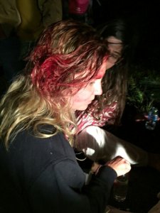 By the time I was able to clamber out the window and move along the small gap between the bus & the trees, Steve was out front assessing the injuries and buddying up non-injured with an injured to help in monitoring condition and assist with applying pressure to wounds. Another passenger, Joel, also had a first aid kit in his bag, so he & Steve teamed up their supplies to get injuries gauzed and wrapped. Paige, with her 5 inch forehead cut, & Elliot, with his split eyebrowand concussion, were bandaged by the time I arrived, showing how quickly the two were working together. Next, he noticed a formerly-blonde-now-red-with-blood-haired girl, Mary, with a bloody head wound. The next patient was Matt, who informed Steve he’d been ejected from the bus upon impact. Seeing quite a bit more injuries on him & with his story, he was listed as first priority of treatment.