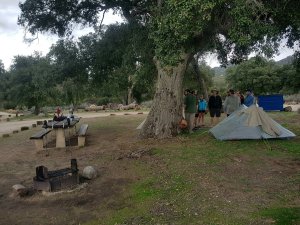 After a bit of a windy night, the 4 of us, joined by Swiss Lucus, hiked out before most of the other 12 hikers had awoken. We played some games while hiking up in elevation to help pass the time. Our lunch break, though a bit later in the day than planned, was at a much appreciated break from the sun, near a very cold creek which brought us water and a cool bath for our feet. We all enjoyed the break quite thoroughly since we only had a few miles left to the town just ahead. We opted for an overnight camp site amoungst the Jeffery Pines about a mile outside of town. We enjoyed some dinner time entertainment with some pancake mayhem, then quickly retreated to our tents as the sun set. Down with the sun, up with the sun.