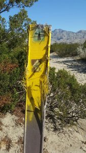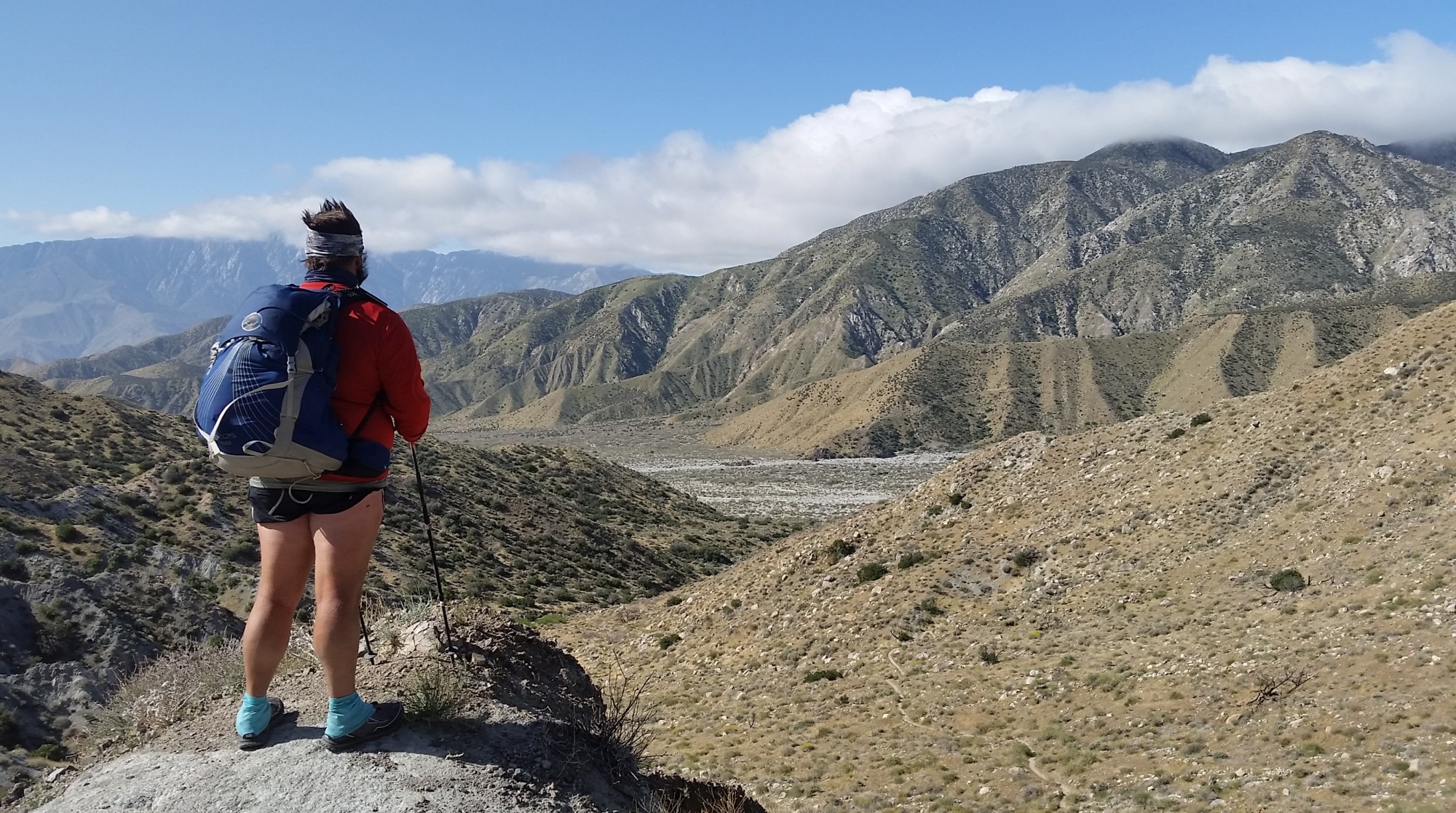 We enjoyed the morning hike down with Beacon (trail name Yogi, perpetually trying to swipe our picnic baskets) leading the way, with Trevor being tugged down trail behind him. Trevor is the owner of a print company that prints animals on head covers and gifted Steve with a new head scarf with a wolf on it. Very cool gift that will now travel the trail with us! We parted ways at the trailhead as we continued ahead along our 15 mile waterless decent into the valley. Just as we thought, – downhill, no problem! – the trail gladly proved us wrong. Fifteen miles of constant downhill opens a whole new can of worms on top of the sun, wind, and general exposure brought by the desert mountainside. Catching a shrinking shadow of a rare tall bush was a greatly welcomed sight. Rationing our water supply throughout the day was a critical task, trying to find the balance between good hydration and making it last to the end of the day, where a water spigot awaited us near the valley floor. Strong muscle spasms, tender feet, new pack adjustments, and mental fatigue slowed us down enough to have us settling into camp as the sun started to settle behind the mountains we had just left.