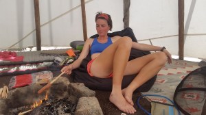 While we roasted hotdogs for lunch in the teepee, inspired by Frodo’s dinner the night before, Mark delivered our box of goodies. Finally, we were geared up with our colorful new gaiters, ready to take on any snow we’d encounter on our way north!