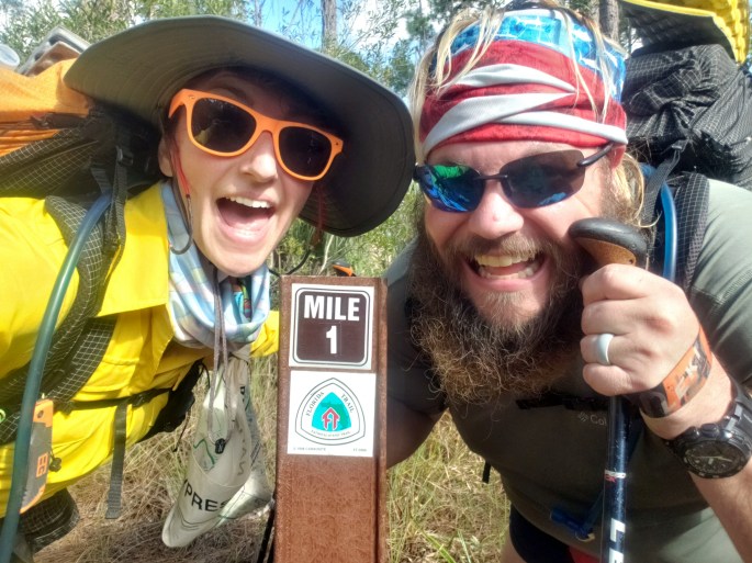 We left the kick-off campground in Big Cypress National Preserve mid-morning on Saturday, ferried to the Southern Terminus by one of the wonderful trail angels who comprise the FT Thru Hikers Association. We filled out permits, geared up, took our kick-off photos, and off we walked towards the first orange blaze. About 15 other hikers had started earlier that morning; some with the goal to hike the whole distance (1100 miles), others hiking until time ran out, and some just out for a nice jaunt through the swamp!
