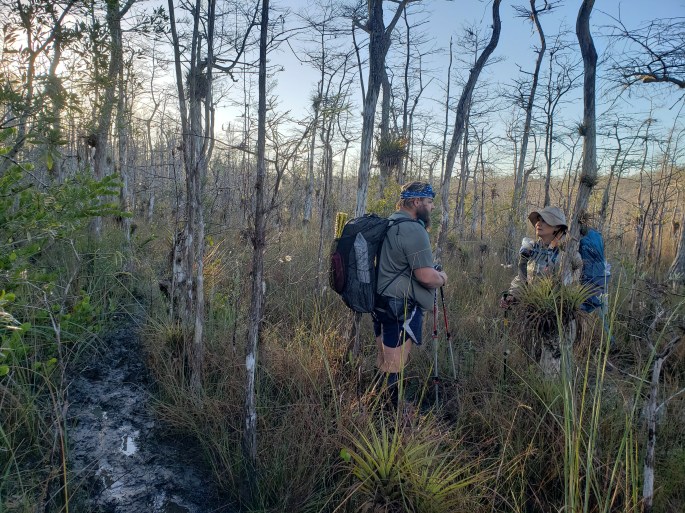 We left camp at first light. With 10 miles to go through difficult terrain, 10 miles could easily take 10 hours (versus 4-5 hours on a normal trail)! The first mile was an easy starter to get our legs moving and stretched before we hit the mucky muck. A low water year means we won’t have waist-high water, but it also means the trail has become nothing but mud. And not the mud you play in to make mud pies as a kid, but rather the mud that you step in and never see your shoe again type of mud. When we weren’t high-stepping with muddy ankle weights, we were blindly shuffling through shin- to knee-deep water, often quite ungracefully, finding many cypress roots and solution holes to trip on along the way. To walk through this area without the aid of trekking poles could be quite detrimental to your knees, ankles, elbows, and pride.