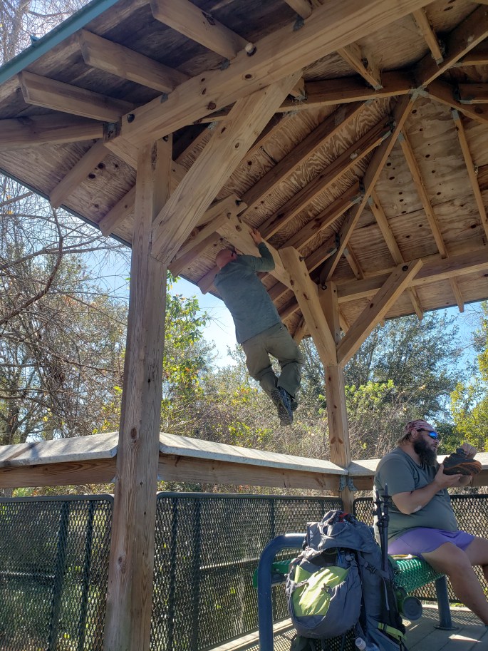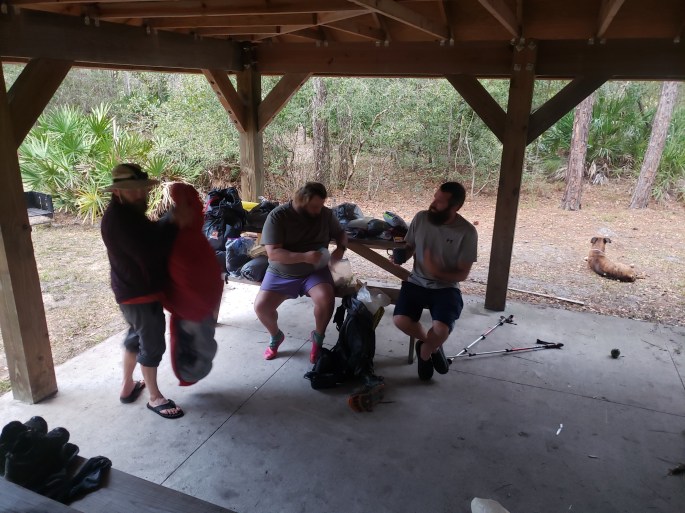 This decision not only helped keep our bodies healthy, but we actually met back up with our friend from night 1 – Shawn/Mountain House, as well as another hiker we’d met in Clewiston, Bumblebee & dog, Brody. We had caught a hitch along a very busy highway from a former AT thru hiker, Ghost, into Melbourne, where we could shower & get some fresh fruit. On our way back to trail, we saw Mountain House & Bumblebee taking a break, so we hopped out to join them.