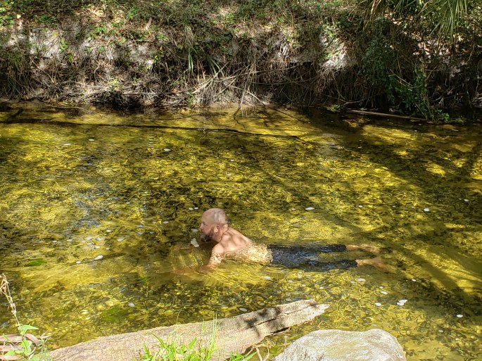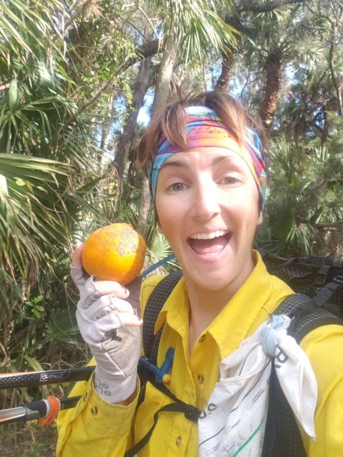 We passed through lackluster Christmas, Florida, a town that was on our radar for a while as the end of a 100-mile stretch with no resupply. We skimmed through quickly, as they apparently haven’t monetized their name with kitschy Christmas stores. Boring. But Mtn House did surprise us that evening with s’mores around the campfire! We also had our first on trail swim, though apparently illegal, and my first wild orange!