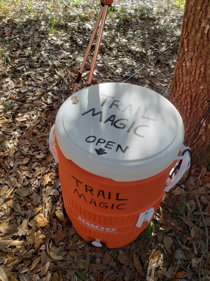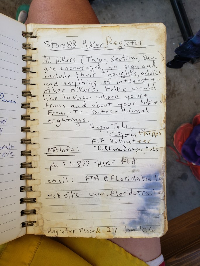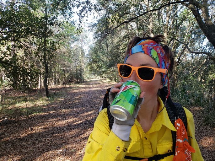 This day was also an “ask and you shall receive” type of day. As we were tromping through some previously burned field in the scorching sun, Steve said, I really just need to sit in the shade and rest. Not 20 feet further, we crossed a road, and bam – 2 lawn chairs in the shade! Luckily, the owners of the house were about to leave, so we waved them down to thank them for the place to rest, upon which they gifted us with some candies, snacks, and a gatorade! We chatted a bit, unknowingly teaching them that this Florida Trail that runs along their yard is a long trail that is 1100 miles long! She thought it was just a local hiking trail around the forest areas. What sweet people!