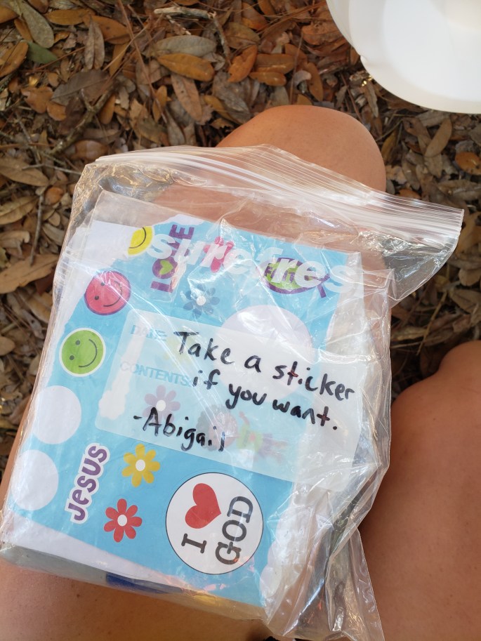 Just over the hill from the campground, we came across a bright orange cooler that said “Open Me”. Inside was the precious sight of sodas and stickers! We happily took a Mountain Dew and signed the log book with profound thank yous which made up for the disappointment of yesterday’s lunch. The trail provides. (And Abigail, who was the angel responsible for this magic).