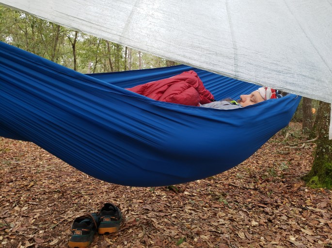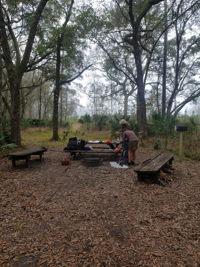 The native Floridians suited up and built a fire while Steve & I barely scraped together the mental energy to deal with my leg, filter water, and cook dinner. Our plan was to sleep in the lower part of the shelter to not have to traverse the narrow ladder and trapdoor of the upstairs, but a little field mouse who had found his way into the shelter changed our plans to a traditional night in the tent next to the shelter, while Jane & Jared (now with trail name Fixie) camped in the loft.