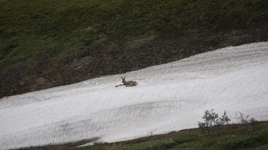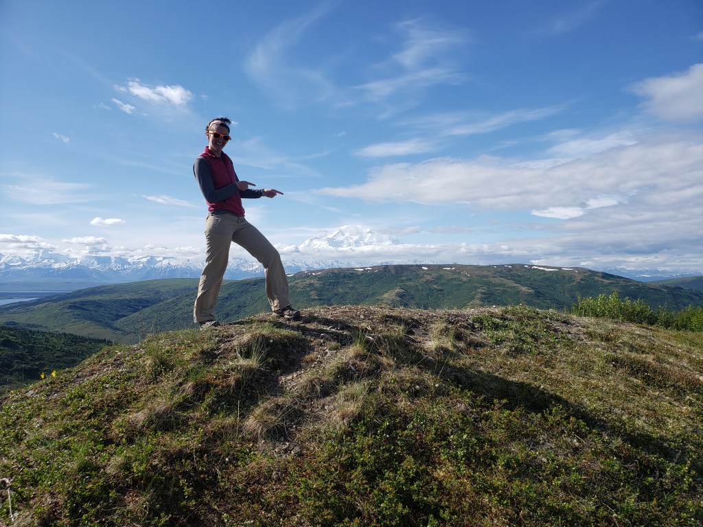 I had the privilege of watching a bear swim across Wonder Lake one morning while on a hike with guests. We got to the top of Blueberry Hill and saw something splashing around in the water down below. We got out the binoculars and cameras to identify the swimmer as a brown bear out playing in the lake! It then swam away from the trail & road to the far side of the lake, just as another group of guests arrived to the lake. They were able to watch it with binoculars across the lake, but they missed the awesome water show just minutes earlier.