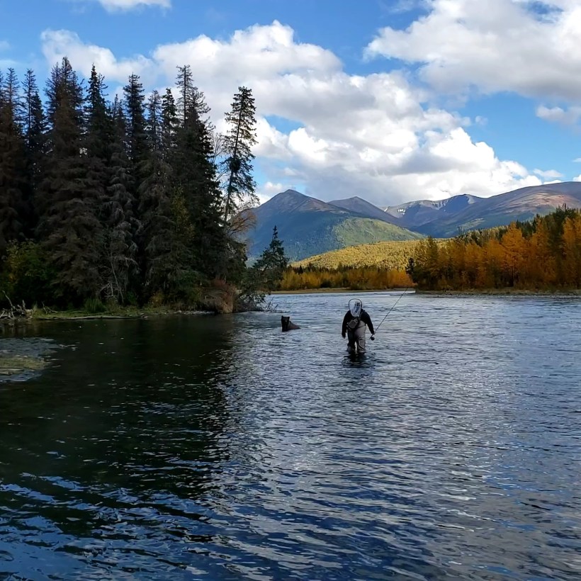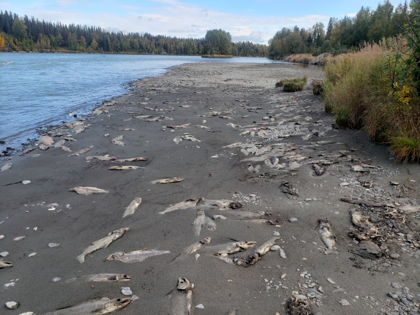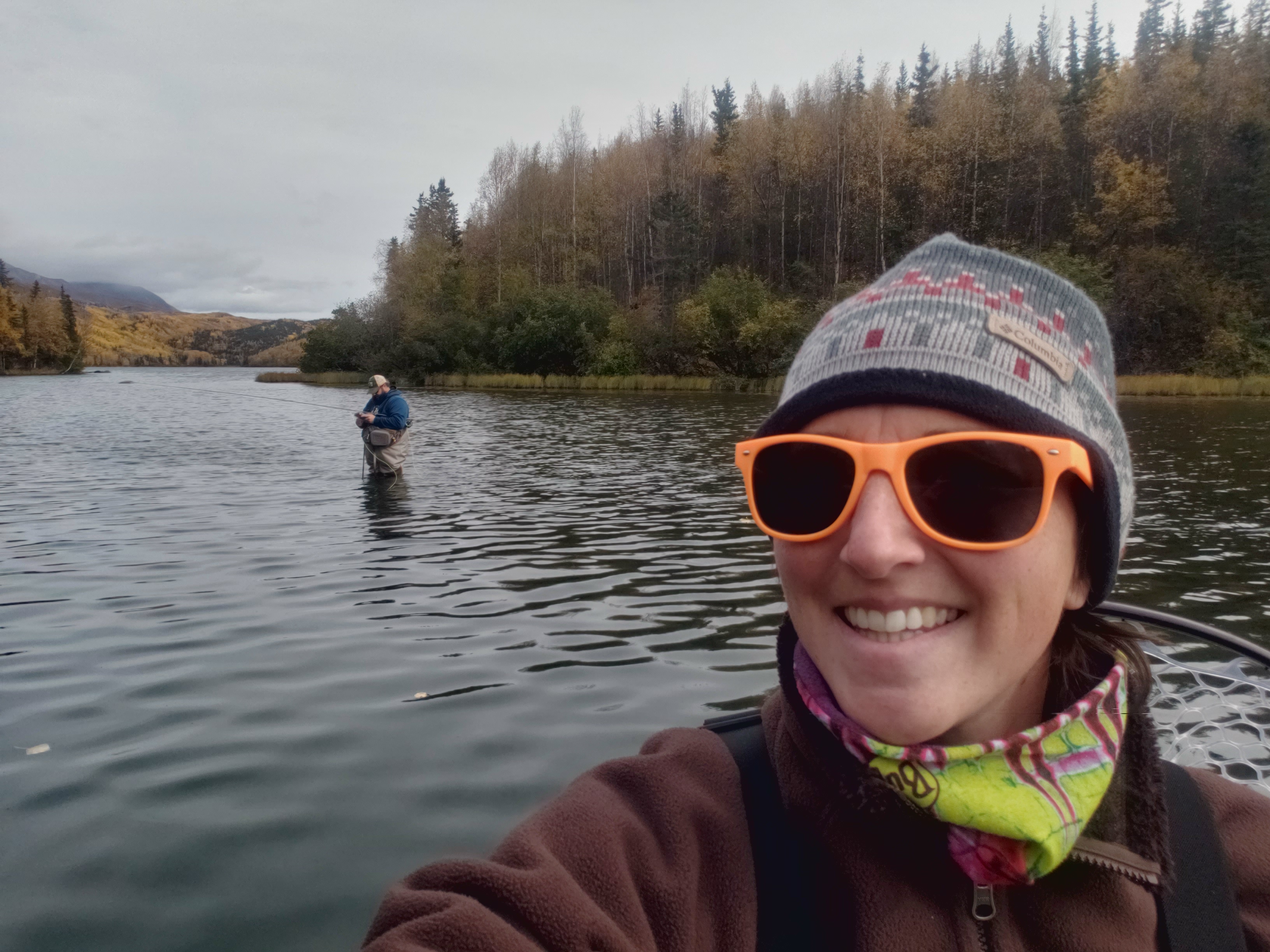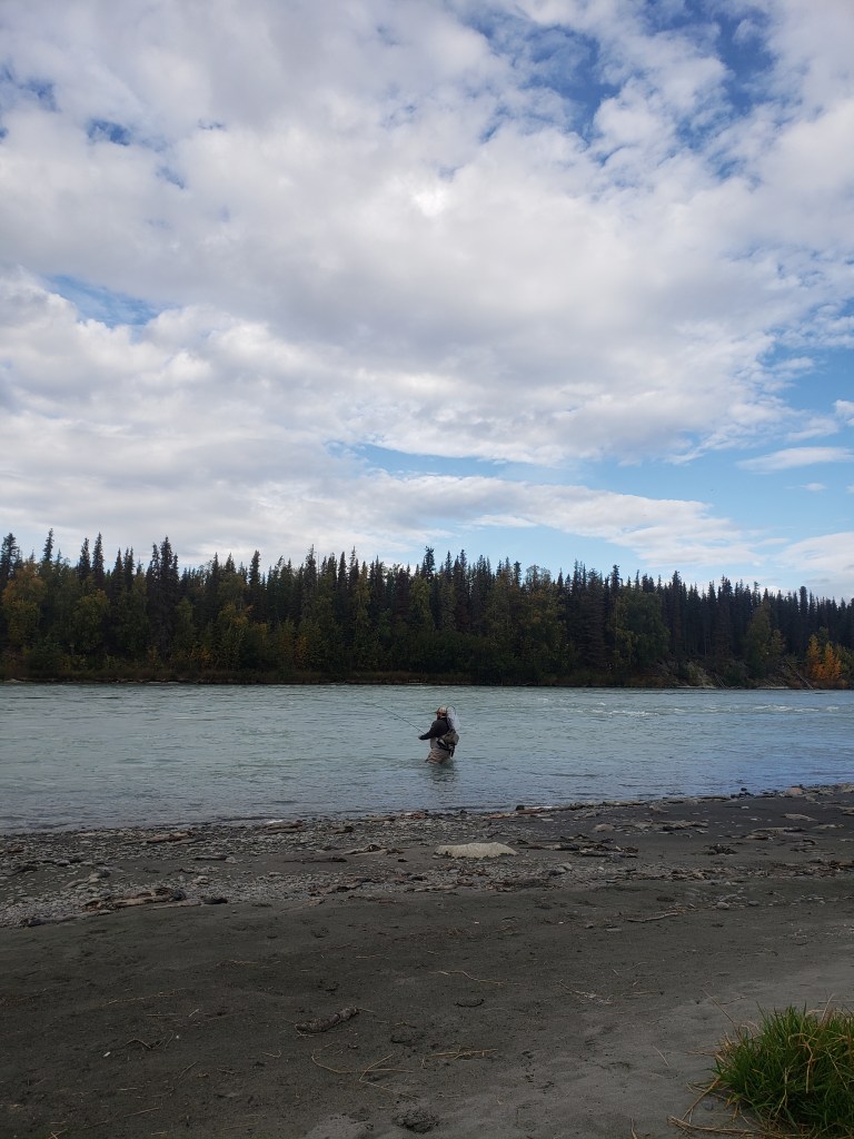 We went into Soldotna for our first morning, on the recommendation of our Air BnB host. Armed with our new flies & some new gear, we hit Centennial Park on the Kenai River to see what we could catch. This large river seemed to be mostly car fishermen aiming for the second run of silver salmon, but we found our way further along the river to some wade fishing places to maybe find some trout. But we were greeted with a salmon graveyard, with salmon carcasses strewn over every inch of the shoreline, having completed the final step of the spawning process – death. Smelled like my hometown of Beardstown. <ha!>