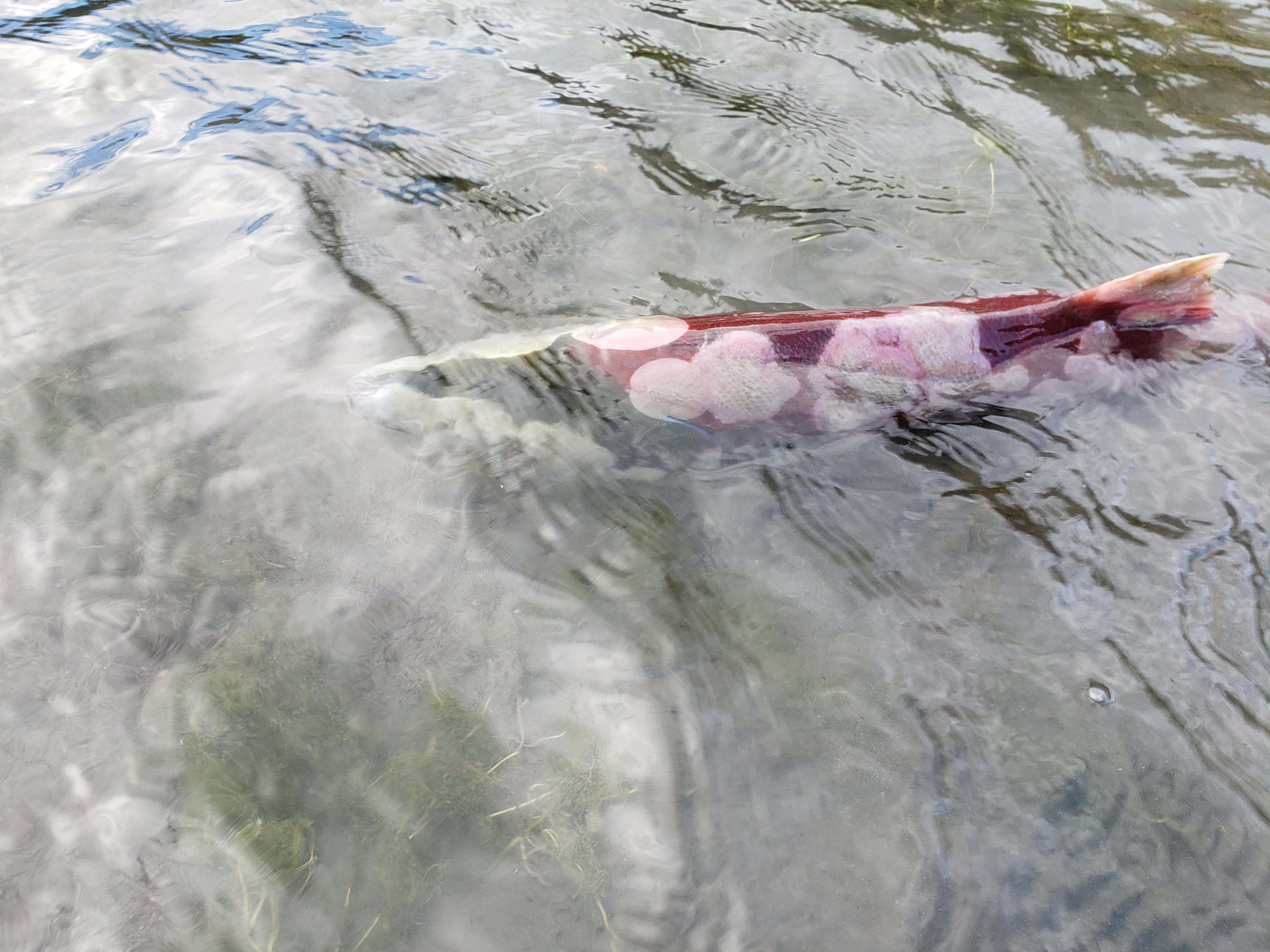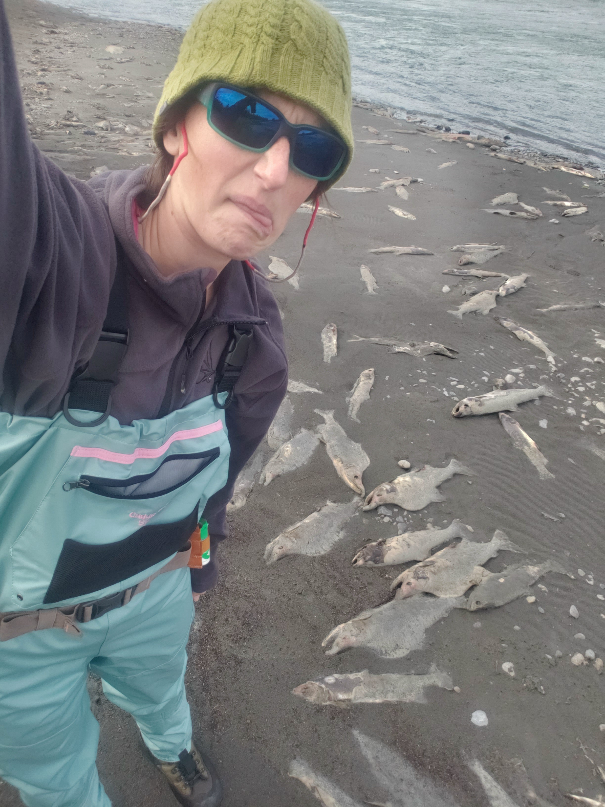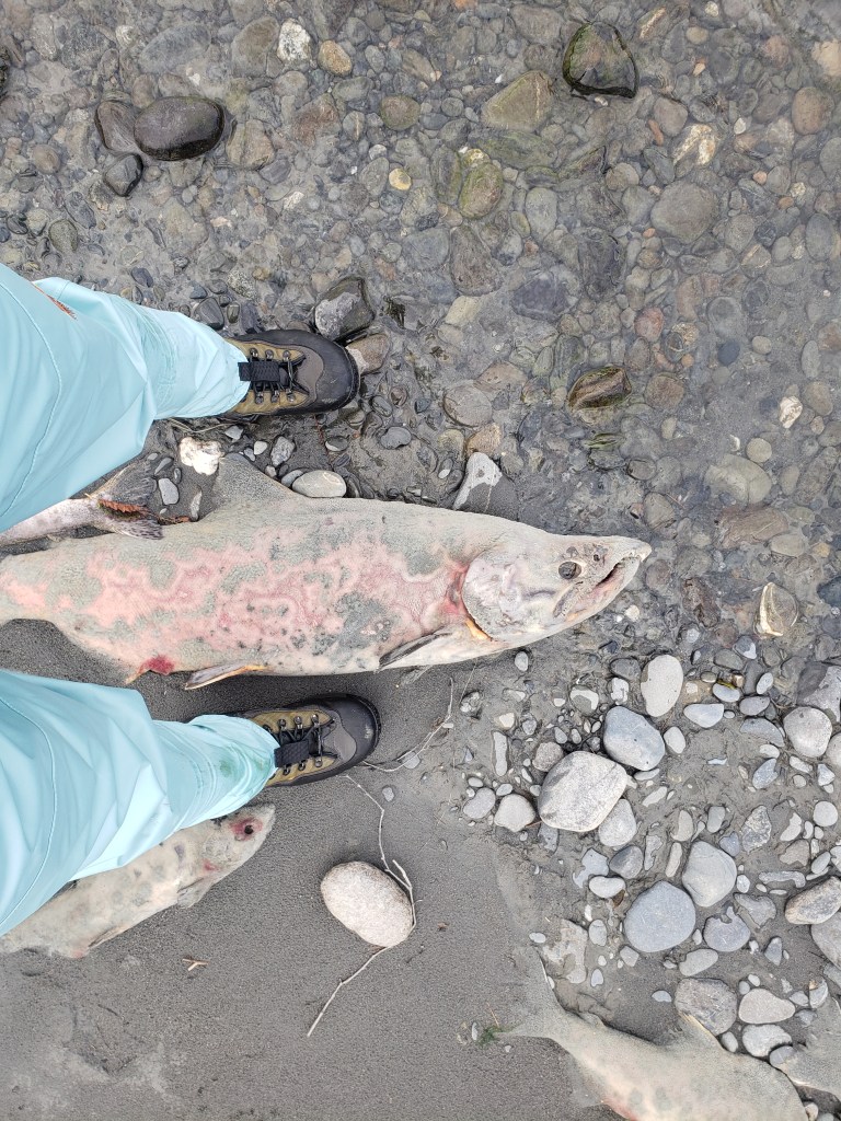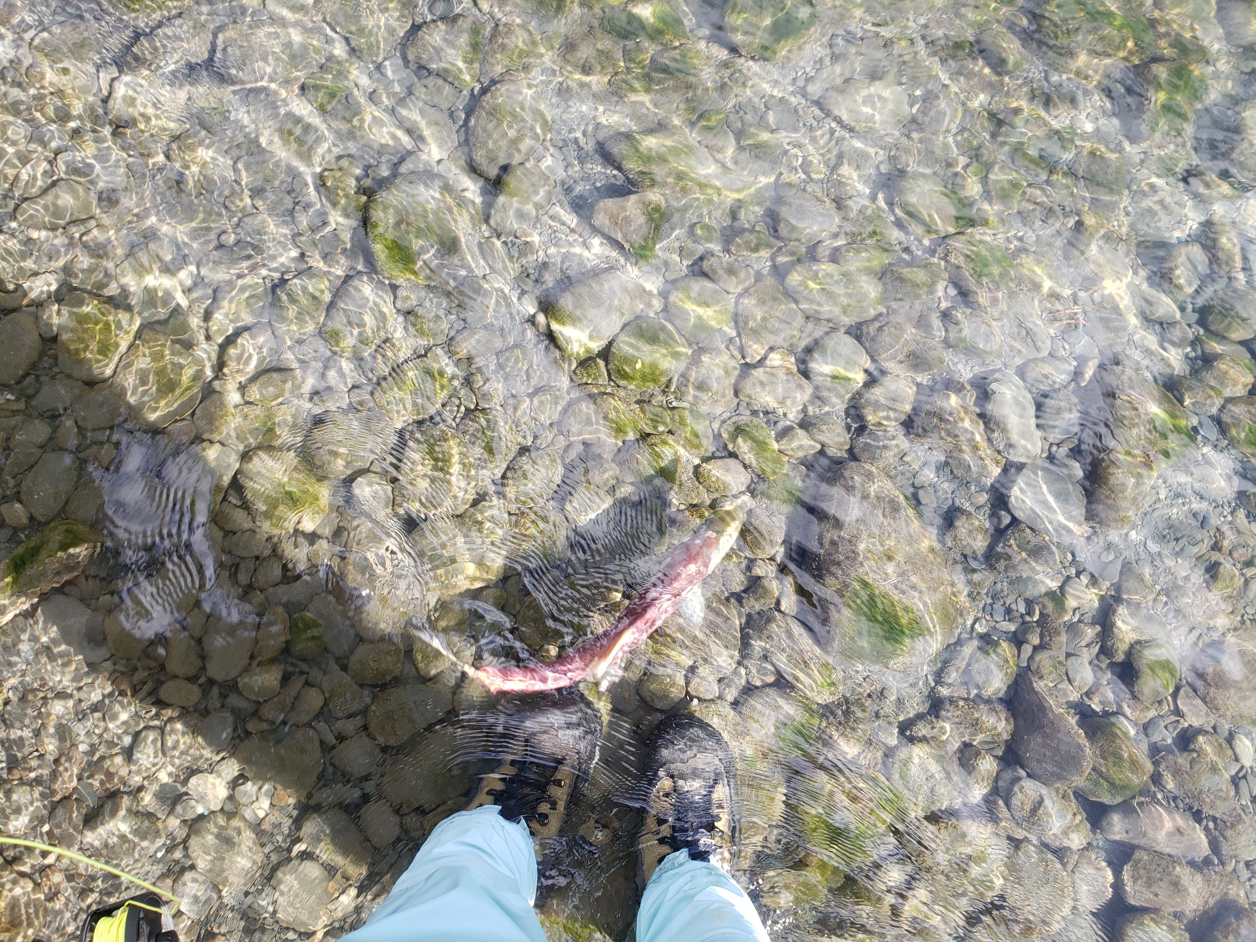 Sounds pretty straight forward and practical. Our boss, Dennis, gave us a lot of information about this type of fishing, and even made some egg “flies” for us to use! The part a new angler doesn’t think about during this fishing time frame is that *dying* part of the salmon spawning process. Boat fishermen may not even think about this much as they are out in the water away from the edges. But wading fishermen, like us, *really* experience this aspect of the season.