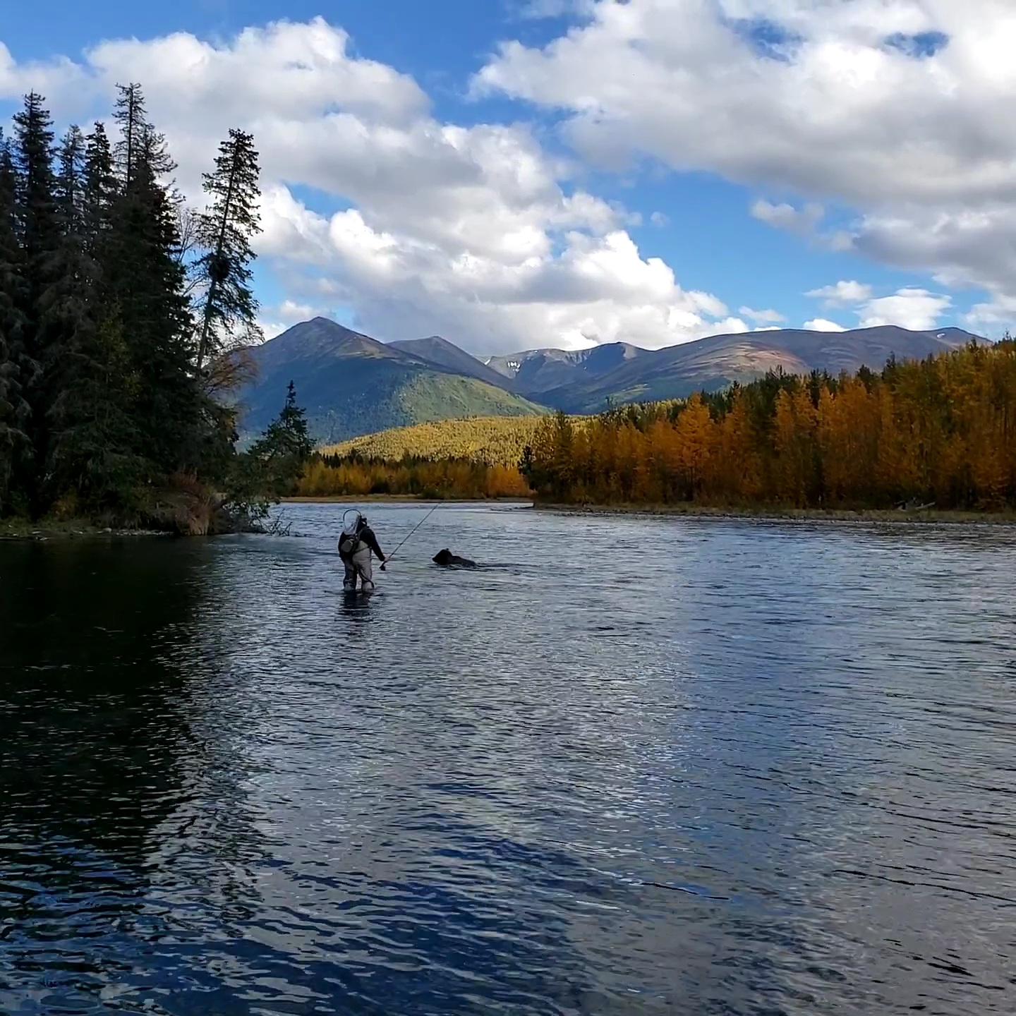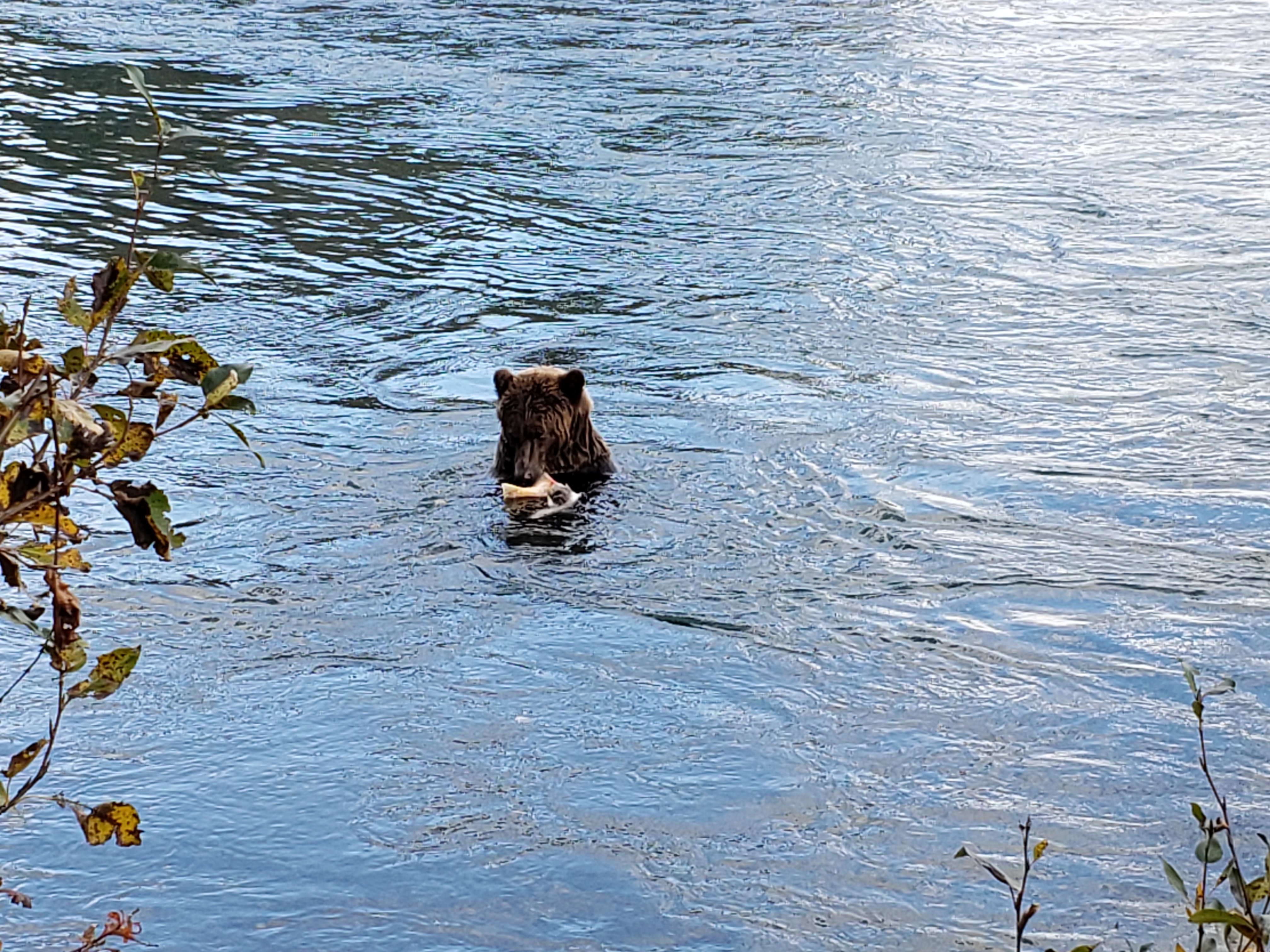 In this moment, Steve was about 15 feet from the bear, 20 yards from me, and 30 yards from the shore behind me. Also to note, I had bear spray. Steve did not today. Fortunately the bear was just as surprised as Steve to encounter each other. The bear began to come into the nook area we were fishing in, while Steve and I both continued backing up to the shore peninsula behind us, where the other 3 fishermen were located. Calm, stern words of affirmation were spoken at the bear as we continued to give space. The bear really just seemed interested in the fish carcasses floating around, which was fine with us!