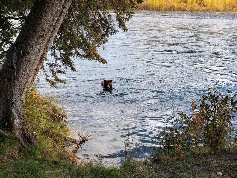Due to the bend in the river, I was fishing with a view upriver, while Steve had a view of down river. I noticed the bear upriver was leaving the shore and entering the water. I called over to Steve to let him know. The bear was still probably 300 yards up river or so, but it didn’t hurt to be mindful. Then suddenly the bear rounded another curve of the river and appeared about 100 yards away. I called over to Steve again to let him know, though we were tucked into a nook of the river, versus the main stream of the river. Before we knew it, the bear popped out around the corner, about 25 yards from Steve. Steve had already started moving back to shore toward me after I said the bear was approaching with the current, but it was a mucky bottom in waist deep water, so he didn’t make much distance before the bear was there.