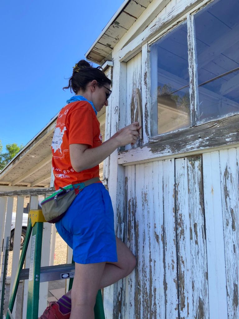 The team divided up to start tackling the house. One group began painting the front where the homeowner & family had already scraped the day before. Another group set up scaffolding on the side to begin painting there. Another on the back side began scraping paint in the shade. And the other group began knocking down the carport walls to rebuild.
